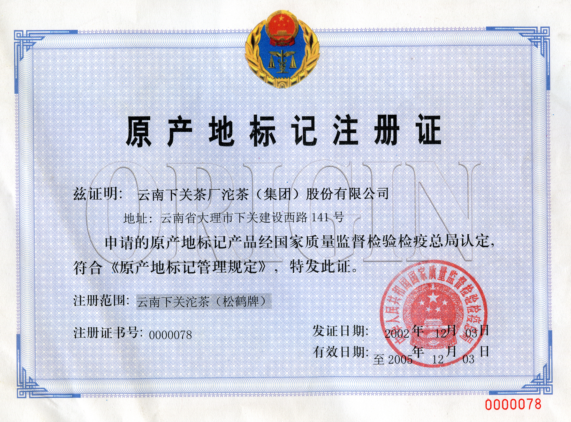 2002年12月 原產(chǎn)地標(biāo)記注冊(cè)產(chǎn)品 國家質(zhì)量檢驗(yàn)檢疫總局