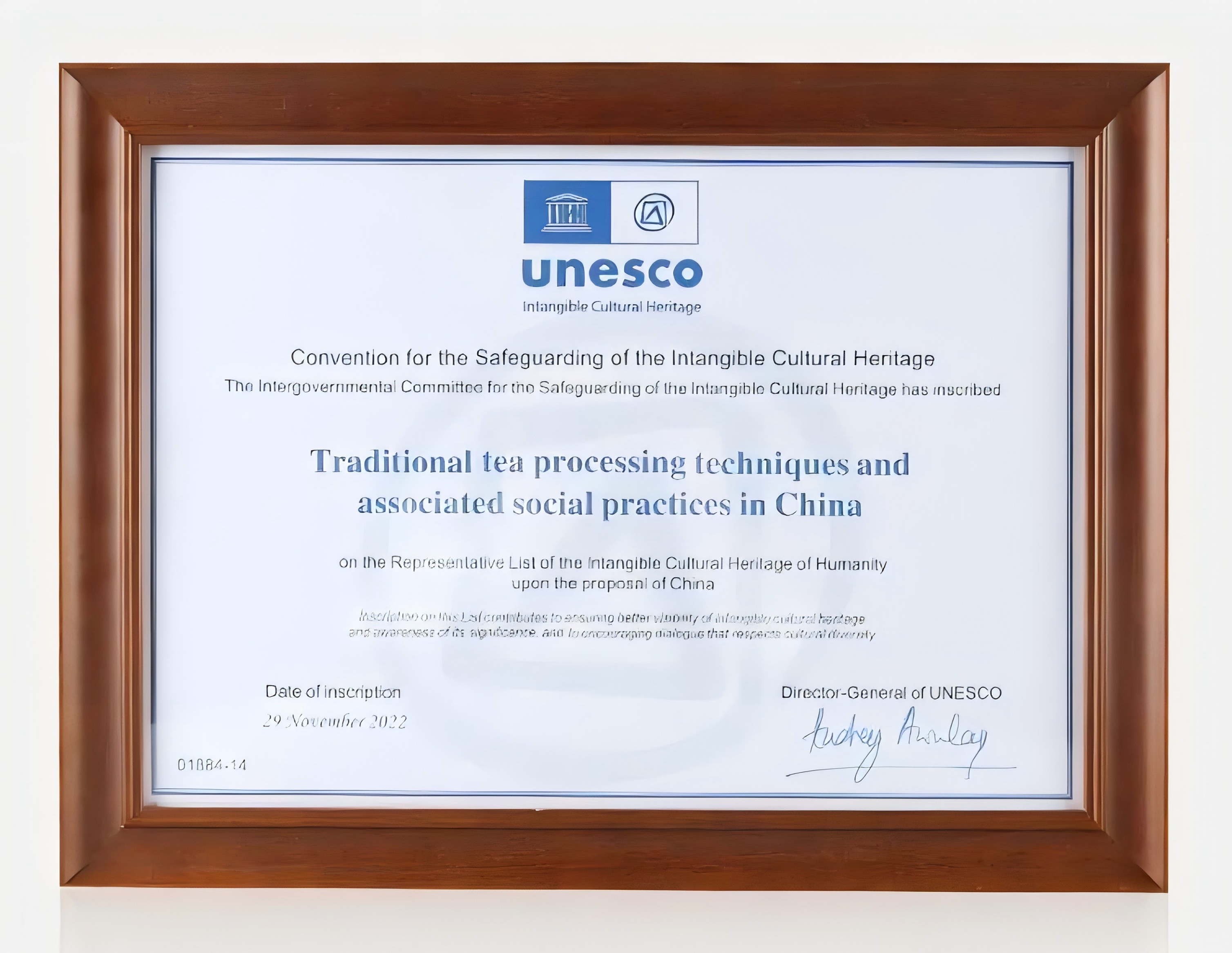 2022年11月29日聯(lián)合國教科文組織頒發(fā)的“中國傳統(tǒng)制茶技藝及其相關(guān)習(xí)俗”列入人類非物質(zhì)文化遺產(chǎn)代表作名錄證書